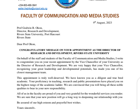 The Faculty of Communication and Media Studies; University of Port Harcourt has congratulated, Prof. Godwin Okon on his appointment as the Director of Research and Development, Rivers State University, Port Harcourt.
