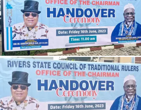 The Immediate past Chairman of the Rivers State Council of Traditional Rulers, HRM King Dandison Jaja (Amayanabo of Opobo) will formally handover to the new chairman of the council, HRM Ohna Sergeant Chidi Awuse Nnewe Eli Emohua XIII (Oloh IV) today, June 16 2023.