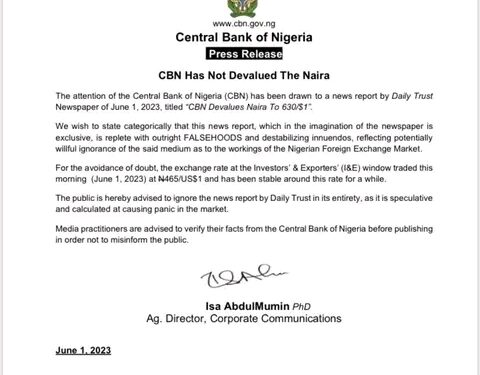 The attention of the Central Bank of Nigeria (CBN) has been drawn to a news report by Daily Trust Newspaper of June 1. 2023. titled ‘CBN Devalues Naira To 630/$1.
