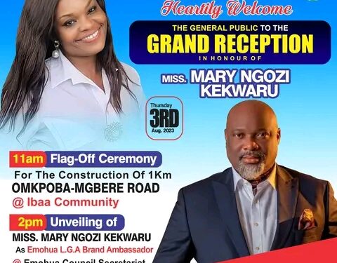 The chairman, Hon. Dr. Chidi Lloyd, DSSRS on behalf of the government and the good people of Emohua local government area of Rivers State, cordially invite leaders, stakeholders and the general public to the Grand Reception in honour of Miss Mary Ngozi Kekwaru, in recognition and appreciation of her exceptional display of honesty and sincerity in returning $70,000 misplaced by a guest at her place of work in Lagos State.