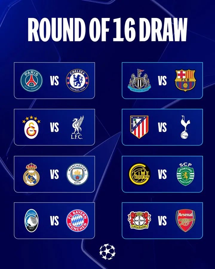 The Round of 16 fixtures for the 2025/26 UEFA Champions League have been confirmed, setting up a series of blockbuster encounters across Europe.