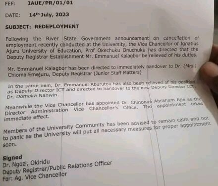Following the Rivers State Government announcement on cancellation of employment recently conducted at the Ignatius Ajuru University of Education, Vice Chancellor of the institution, Prof. Okechukwu Onuchuku has directsd that the Deputy Registrar Education, Mr. Emmanuel Kalagbor be relieved of his duties.