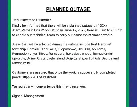 The Port Harcourt Electricity Distribution Company, PHED, has announced a planned power outage on 132/kv Afam/phmain Lines 2 on Saturday, June 17 2023 from 9:00am to 4:00pm to enable its technical team carryout maintenance works.