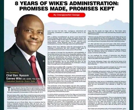 But as he leaves office, many Rivers residents would remain grateful to His Excellency, Chief (Barr.) Nyesom Ezenwo Wike for the social changes he promoted and implemented, and for the promises he made and fulfilled over the past eight years of his administration.