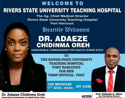 Heartily Welcomes Dr. Adaeze Chidinma Oreh Honourable Commissioner for Health Rivers State to the Rivers State University Teaching Hospital for her first official visit on Monday 7th August, 2023.