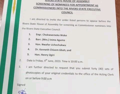 The Rivers State House of Assembly has screened and confirmed another set of five commissioner-nominees.