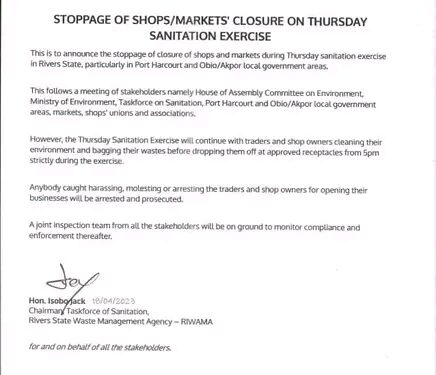 The Rivers State Waste Management Agency, RIWAMA has announced the stoppage of closure of shops and markets on Thursdays during sanitation hours particularly in Port Harcourt and Obio/Akpor local government areas.