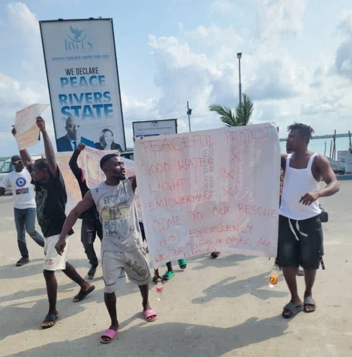 Some youths who claim to be from Opobo/Nkoro Local Government Area of Rivers State, the hometown of Governor Siminalayi Fubara, have taken to the streets of Opobo to protest what they described as worsening hardship and widespread unemployment in the area.